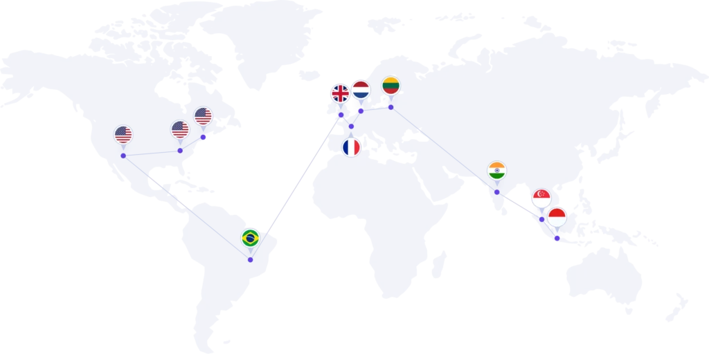 Planes de hosting web, WordPress y cloud hosting ofrecen ubicaciones de servidor en: Estados Unidos, Reino Unido, Francia, India, Singapur, Brasil, Lituania y Países Bajos.
